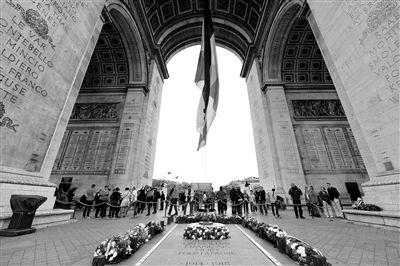 随后,总统奥朗德在法国共和国卫队的骏马围绕下,乘车前往凯旋门星形广场,军乐队奏着《马赛曲》。奥朗德总统在瓦尔斯总理和国防部长勒德利昂陪同下,检阅了法国军队和军校学生。然后奥朗德向凯旋门下的无名战士墓献蓝白红色花环,并点燃无名战士墓的火苗 ,进行凭吊。无名烈士墓兴建于1920年11月11日,也就是一战停战纪念日。从1923年11月11日起,无名烈士墓点燃长明火,象征先烈英灵永垂不朽。记者在仪式结束后的现场看到,石碑上镌刻着这样一行文字:“致所有为国牺牲的士兵”。