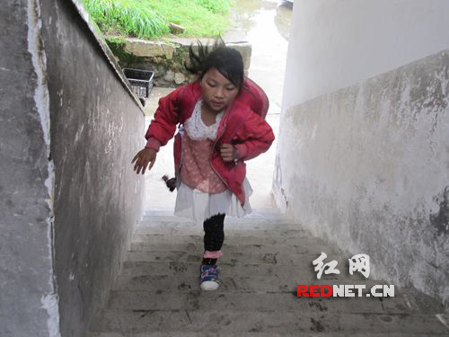 (到学校后,只有一条腿的女孩曹珂努力上楼。)