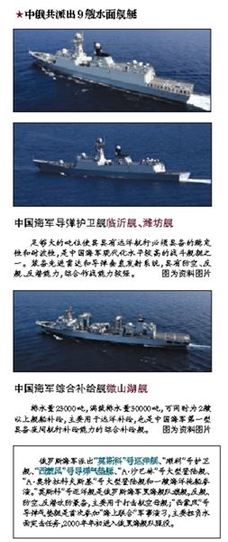 中俄双方共派出9艘水面舰艇参加演习。其中中国派出在亚丁湾和索马里海域执行第19批护航任务的“临沂舰”、“潍坊舰”、“微山湖舰”参加演习。3艘舰船结束第19批护航任务后,未经休整即开赴参加演习。8日,中国海军参演舰艇抵达俄新罗西斯克港,这是中国海军舰艇首次停靠该港。