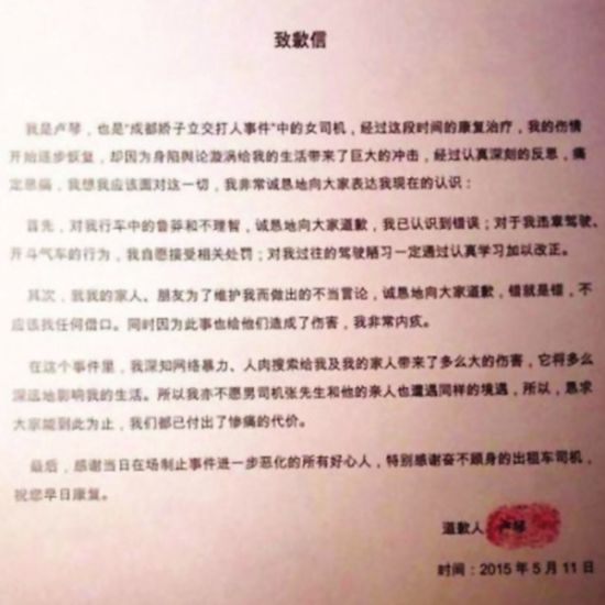 11日上午,自称“成都娇子立交打人事件”中的女司机卢琴公开发布一封致歉信。信中称,经过这段时间的康复治疗,她的伤情开始逐步恢复,却因为身陷舆论漩涡给生活带来了巨大的冲击。经过认真深刻的反思,痛定思痛,决定面对这一切。