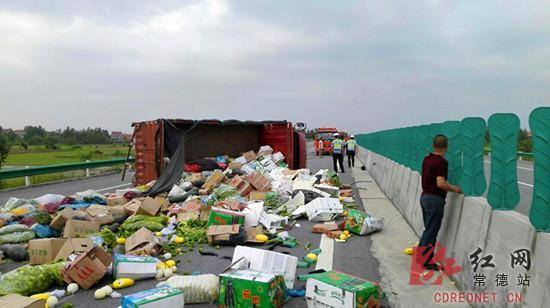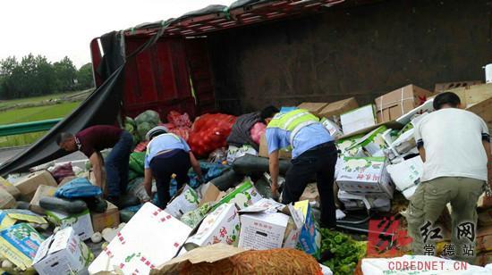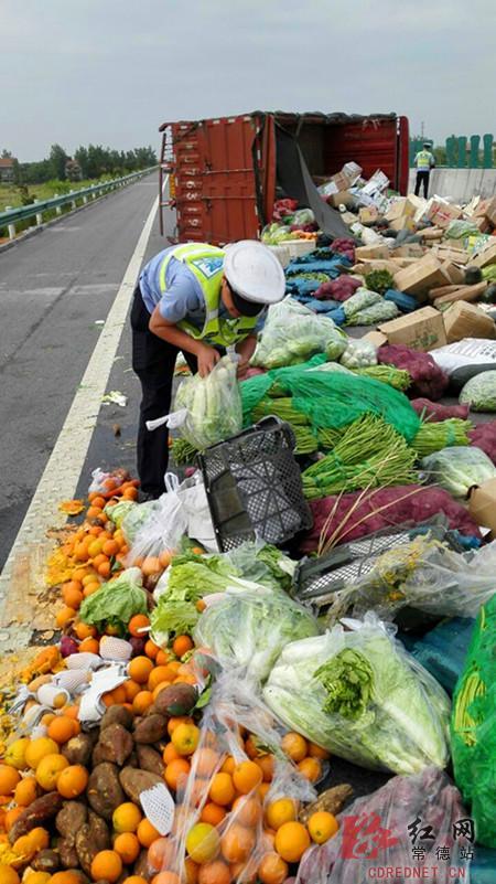 (原标题:常德:货车侧翻数十吨果蔬“满地跑” 交警秒变搬运工)