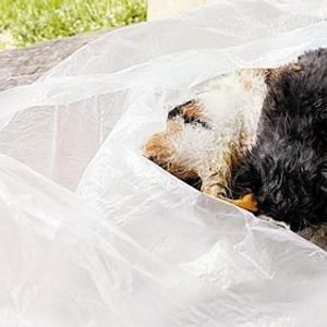 被装在塑料袋里缩成一团的四只小猫