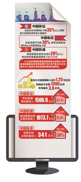 工信部副部长尚冰15日说,2015年底直辖市和省会城市等主要城市的宽带用户平均接入速率提至20Mbps,其他城市提至10Mbps,力争年底前手机流量平均资费水平和固定宽带单位带宽平均资费水平同比下降30%左右。三大运营商纷纷响应,当天纷纷公布提速降费方案,资费最高降幅35%以上。