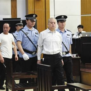 5月18日,太原市中院开庭审理王文军等人涉嫌犯故意伤害罪、滥用职权罪案。被告人王文军(前右二)等人被带入法庭。新华社记者 燕雁 摄