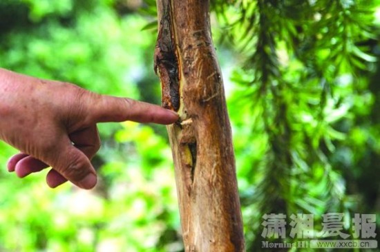 罗汉松树的树皮被猴子扒光。