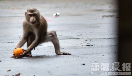5月19日,长沙暮云街道西湖村一村民家前坪,小猴抱起村民放在地上的橘子快速逃离。组图/潇湘晨报记者谢长贵