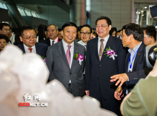 红网郴州5月21日讯(时刻新闻记者 彭双林 摄影 明健飞)5月21日上午,第三届中国(湖南)国际矿物宝石博览会在中国观赏石矿物晶体之都——郴州拉开帷幕。国土资源部部长、国家土地总督察姜大明宣布开幕,湖南省委副书记、省长杜家毫出席。