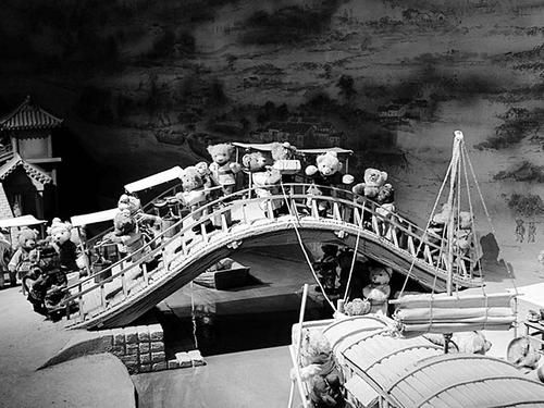 这里每只可爱的泰迪熊背后都拥有一个动人的故事。在中国馆的分区域内,水墨山水画的背景前,几只小熊身着渔家服饰撑着乌篷船行进在河道中央,搬抬着箱笼的“客商”们让河面上的拱桥显得熙熙攘攘,城门前更有“达官显贵”骑着高头大马在“仆人”的随侍下巡查……好一幅生动的《清明上河图》;在《西游记》的故事场景里,唐僧师徒和一众大小妖精全都由泰迪熊装扮而成,尤其八戒更堪称神似,着实让人忍俊不禁;而在一排兵马俑当中,几只小熊被安置在陶俑四周,既像是在参观的游客,又像是在检阅部队的军官,颇为生动。