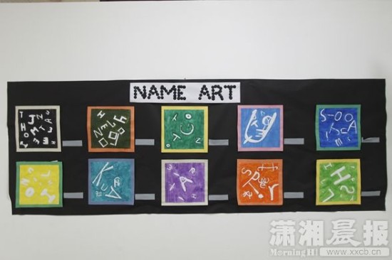 小学部作业展示:孩子们用自己的名字作画。图/潇湘晨报记者华剑