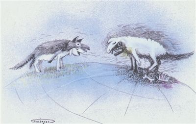 国外漫画赏析 工人日报 2015.05.2310:10 关注 老狼为捕获小动物披上羊皮,绵羊装扮成狼则是为着保护自身。两者不期而遇,除了彼此“害怕”还有点头脑发蒙……【摩洛哥】戈洛(原标题:国外漫画赏析)