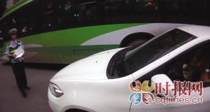 民警在前面一个三岔路口看到,一辆左转的公交车车身横在路中间,在它的左后侧,贴身停着一辆白色轿车。