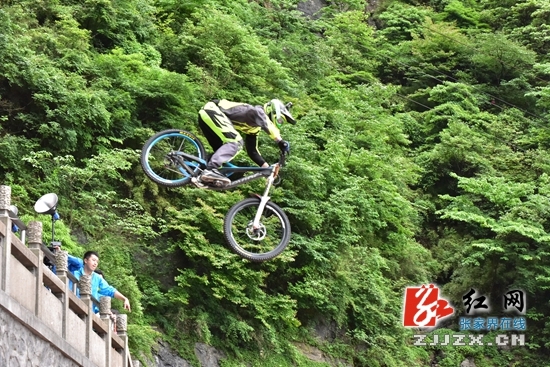 几十秒钟速降,肾上腺素急升,惊险刺激,扣人心弦……在这条平均坡度近40度由999级阶梯构成的赛道上,选手们从天门洞口出发,俯冲骑行整条天梯,并腾空飞跃跨度超过12米、高差超过5米的跳台完成比赛,时间最短者为胜。