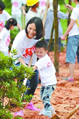 我爱绿广州“广州日报林”植树活动,在广州市儿童公园举行,60户家庭参加。全家植树,其乐融融。