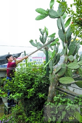 “品种是食用仙人掌,土壤用鸡粪和兔子粪混合培养过,其他也没有什么特殊护理。”彭绍平说,楼顶的其他花木还好护理,这株仙人掌不好靠近,扎到刺很疼,没法碰。