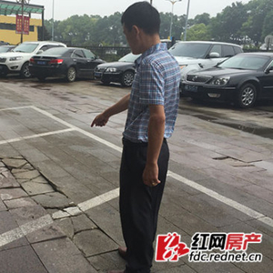 (万达公馆商铺业主指着被进出车辆压坏的地面非常无奈。)