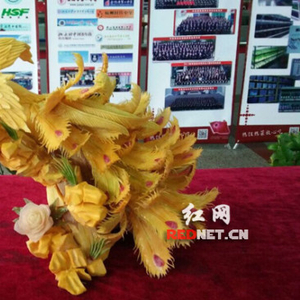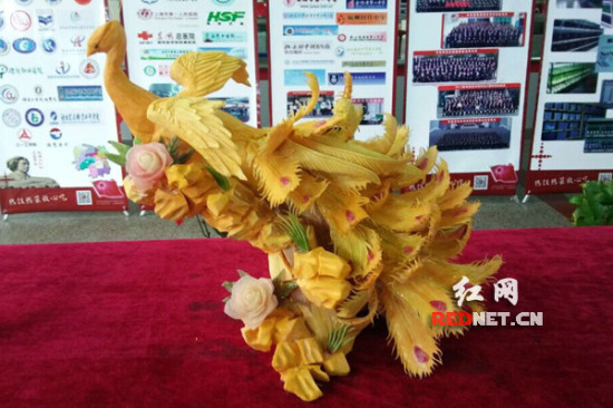 (湖南师范大学学校江边学生食堂,用南瓜雕刻的凤凰正呈现在参展台上。)
