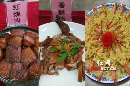 (厨师们为同学们烹饪的菜红烧肉、香酥鸡和大盘虾,平常食堂里都有这些菜。)