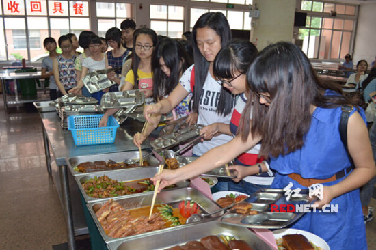 (湖南师范大学学生正作为评委排队领菜。)