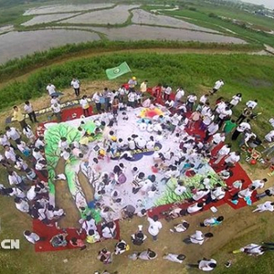( 在一块100平米的画布上,男女老少共同描绘自己心中的大泽湖美景。)
