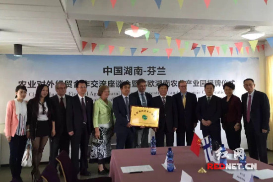 在湖南省农委、湖南省外办、湖南省林业厅、湖南省水利厅领导以及芬兰政府官员见证下,“北欧湖南农业产业园”正式成立。