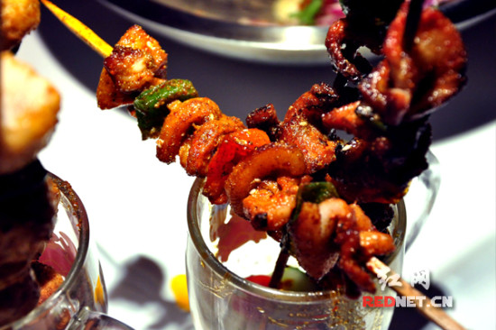 肥瘦搭配相间的串烧五花肉成为最受欢迎的小吃,闻上去就有一种诱人的炭火味道,瘦肉鲜嫩不老,肥肉油而不腻,再加上些许蔬菜的“客串”,那种美味,谁吃谁知道!