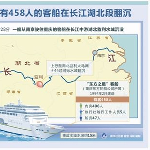 6月1日约21时28分,一艘从南京驶往重庆的客船在长江中游湖北监利水域沉没。据长江航务管理局最新情况,出事船舶载客456人,其中内宾405人、旅行社随行工作人员5人、船员46人。