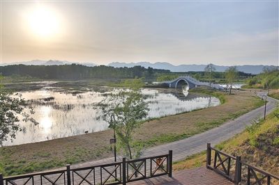 位于延庆县金牛湖畔的龙湾国际露营公园,总面积达180万平方米,在全部保留原有金牛湖湿地环境的基础上广泛栽种植被花草,也是一座开放性的自然生态公园,生态步道蜿蜒,空气清新,夕阳倒映于湖面,不知名的鸟儿不时排列着扑扇翅膀踩水而过,惊起一串串涟漪。
