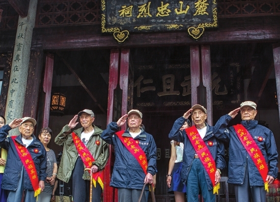 6月3日,抗战老兵们在岳麓山下忠烈祠前敬军礼,追忆往昔,缅怀战友。图/潇湘晨报记者 张迪