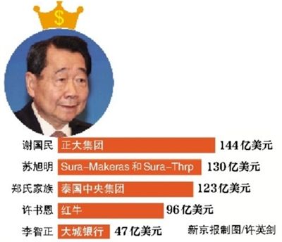 6月4日,《福布斯》公布了2015年泰国富豪榜,泰籍华人,正大集团总裁谢国民以144亿美元的身价重回泰国首富的宝座。而这一身价只相当于中国首富王健林(242亿美元)的约60%。泰国共有50位富豪上榜,上榜门槛为4.25亿美元。