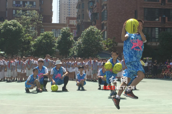 (星辰篮球俱乐部的队员们表演花式篮球。)