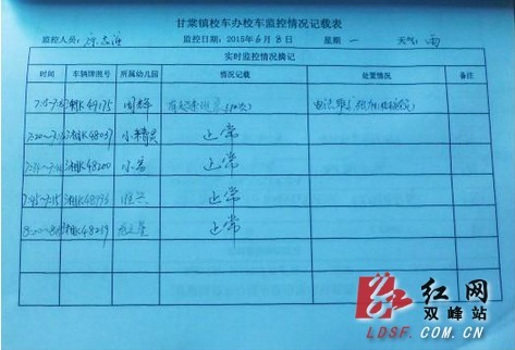 监控情况表红网双峰站6月9日讯(分站记者 龚闯 通讯员 熊虬)6月8日早上6点,双峰县甘棠镇心学校校车监控室内,工作人员康志强正密切关注着眼前的视频监控。他介绍道:自从装了这套“3G实时监控系统”后,只需要轻点鼠标,就能看到校车3G摄像头实时传回的画面,随时观察到14辆校车的运行状态,及时掌握校车是否存在违法违规行为,可以实行全程监管,全时智护。