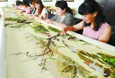 湖南日报6月9日讯(记者 刘银艳)9名绣女一字儿排开,在一幅巨幅长卷湘绣前飞针走线,最后,在一匹用独创“立体针”绣制的白马马背上,中国工艺美术大师江再红用细细的桑蚕丝线添上最后一针。今天上午,长卷湘绣《百骏图》在长沙市开福湘绣研究所正式封针,并即将启程送往2015意大利米兰世博会湖南活动周展出。
