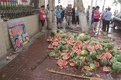 上演砸西瓜大战,执法队员坦言是自己不愿意看到的。在此之前,他们也做了大量的劝离工作,还安排好西瓜销售点。但是对于这种过激的、容易引发市民误会的举动,下一步怎么走,他们很头疼。记者 李立立 摄影报道