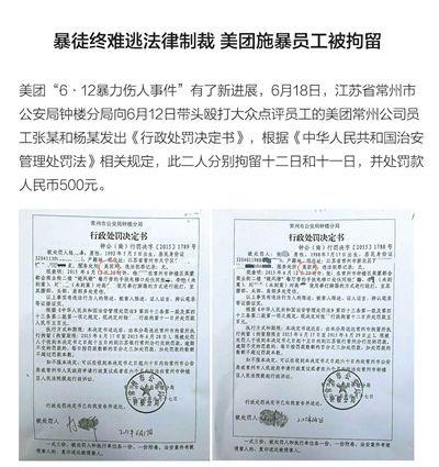 昨天,大众点评官微发布声明称:6月18日,江苏省常州市公安局钟楼分局向6月12日带头殴打大众点评员工的美团常州公司员工张某和杨某发出《行政处罚决定书》,根据《中华人民共和国治安管理处罚法》相关规定,此二人分别拘留十二日和十一日,并处罚款人民币500元。