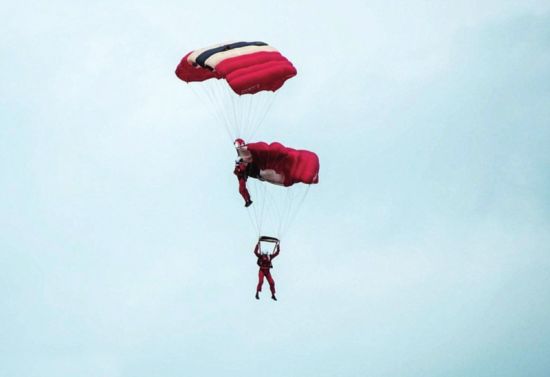 英国陆军“红魔”(RedDevils)特技跳伞队是蜚声国际的著名跳伞表演队,曾在世界多地进行跳伞特技表演。6月20日,该跳伞队在英格兰坎布里亚郡“怀特海芬飞行表演秀”展现跳伞绝技时,没料到却演出了一场“空中惊魂”。当时两名队员表演的是空中堆叠(stack)技巧,现年34岁的士官迈克突然连人带伞像秤砣一般急速向下坠落。原来,他的降落伞意外卡住,根本打不开!