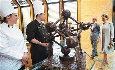 近日,比利时皇室御用巧克力品牌GODIVA歌帝梵巧克力大师Chef Ilse Wilmots受邀参与制作重达11公斤、以比利时原子球为原型的巧克力雕塑模型,在2015米兰世博会上亮相。比利时王后马蒂尔德亲临国家馆日开幕,并对这一巧克力微缩模型表示出极大的兴趣。