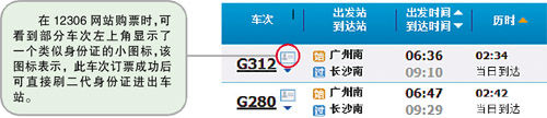 此外,南站工作人员向记者透露,旅客在12306网站购票时会看到部分车次左上角显示了一个类似身份证的小图标,该图标就表示此车次订票成功后可以不用取纸质车票直接刷二代身份证进出车站。旅客订票成功后,12306网站也会向旅客的邮箱和手机发送信息,如果信息提示旅客“可持二代身份证直接检票乘车或换取纸质车票后乘车”则表明旅客可以刷身份证进出站。