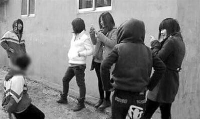 下跪的孩子,施暴的少年,这样的场景令人不寒而栗。图片来自新浪网
