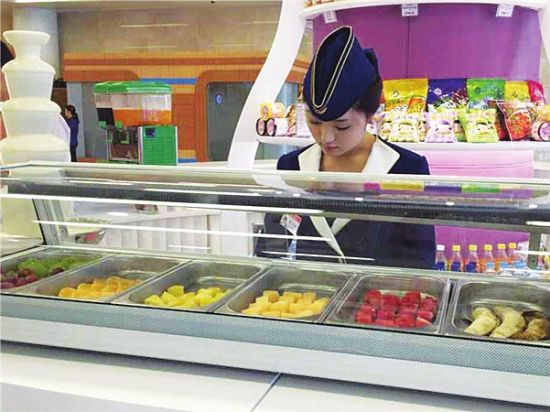 近年来,喝咖啡在朝鲜越来越成为一种时尚,高档咖啡厅落户新航站楼还不足为奇,一层右侧食品专柜的“巧克力喷泉”则让记者眼前一亮。