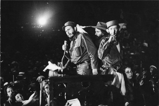 图说:1959年1月8日,在古巴一个军事基地,古巴革命领导人菲德尔·卡斯特罗向支持者发表演讲。