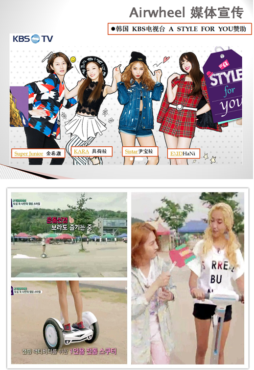 爱尔威电动平衡车(官方:http://www.airwheel.cn/)新颖炫酷热销全球,一直以来都受到各大电视台青睐。现在,爱尔威宣传平台再上新台阶,韩国SBS电视台与爱尔威合作拍摄现代公益广告,KBS电视台更是直接提供赞助,将爱尔威电动平衡车搬上节目。