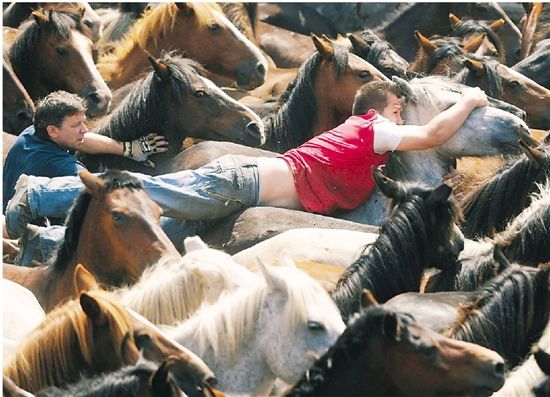 7月5日,在西班牙萨武塞多,一名男子在捕野马活动中试图驯服野马。当日,西班牙萨武塞多举行传统捕野马活动,数百匹野马聚集到此地。该活动在当地有约400年历史,捕马人要在活动中努力驯服野马,并修剪其鬃毛。