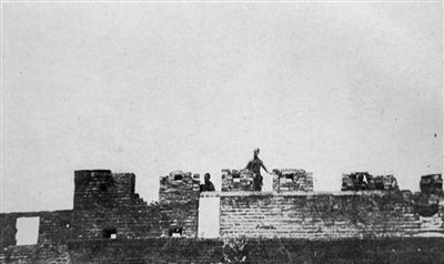这是日军1937年事变发生后拍摄的第29军将士在宛平县城上监视日军图。图上可见城墙上弹痕累累,残破不全,显示宛平县城刚刚遭受过日军十分猛烈的炮击(资料照片)。新华社发