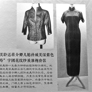 众人皆知宋美龄最爱旗袍,而这次展览中有一套总统府(中国近代史遗址博物馆)上报的旗袍,是宋美龄送给蒋介石同父异母哥哥蒋介卿儿媳孙威美的一套深紫色“寿”字花纹纱织旗袍套装。领部是翡翠水钻扣,内里浅黄蚕丝。富贵典雅。昨天,刘媛之讲述道:“在蒋介卿身上有段故事,他在听说蒋介石西安事变之后,特别担心,在看戏的时候就突然中风倒下了,结果蒋介石没事了,蒋介卿却过世了。这套旗袍后来由孙威美的女儿蒋孝明捐赠给总统府。”