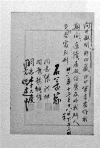 还有南京战犯军事法庭少将庭长石美瑜保存的侵华日军向井敏明、野田岩、田中军吉死刑判决书,“这是庭长自己留存的底稿,这三个侵华日军是百人斩的杀人狂魔。这份底稿上面也有印章,虽然是草稿,但也很正式。这些底稿他当年带到了台湾,而55年后又重回南京,是他的后人捐赠的。”