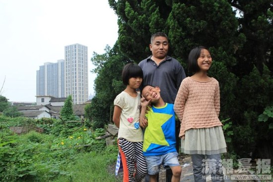 7月5日,长沙市雨花区井塘村,楠楠(右一)与爸爸、弟弟妹妹合影,因为周围环境不好,他们准备搬家。图/潇湘晨报记者陈正