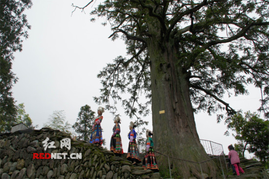 沿着石板路,走到村寨口,只见,一片苍劲古杉昂首挺立,直入云端。欧阳孝金透露,这片古杉群共38棵,其中村口前的一棵树龄达千年,被称为“湖南杉树之王”。侗乡人“万物有灵”的观念很深,人人都崇拜古木,在他们看来,村前的这棵古树是“遮水口”的风水林,象征着村寨的兴旺吉祥,任何人不得砍伐和破坏,甚至还立下条款维护古树的安危。