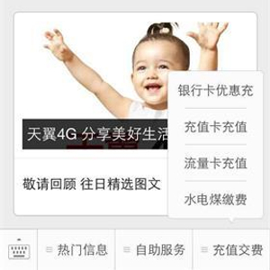 近期,中国电信继推出手机翼支付之后,在微信公众号上又添用户缴费新渠道,除了充值卡、流量卡方式,还可以通过银行卡直接办理,多种业务,足不出户,一站办理。用户只需关注中国电信客服微信号(zgdxkf),在“充值”菜单中选择“银行卡优惠充”,即可通过银行卡直接选择充值金额并完成充值。