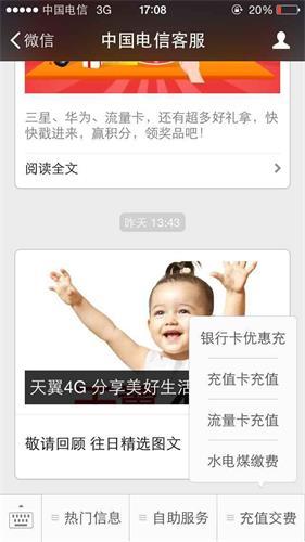 电信客服微信推银行卡缴费 98折充值再送惊喜