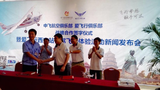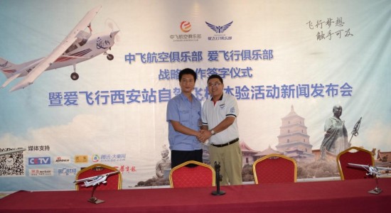 自7月4日爱飞行北京八达岭自驾飞行首航大获成功后,2015年7月12日古都西安也迎来了中国最大的自驾飞机及空中游览项目服务商,自驾飞机第一品牌—“爱飞行”。现场,爱飞行与中飞通航举行了签约仪式,强强联手,双方正式成为战略合作伙伴。未来将联合打造爱飞行卤阳湖飞行基地。通过组织丰富多彩的用户活动,展示航空历史和技术应用,为中国自驾飞机用户带来非凡的创新体验。